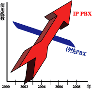 據(jù)美國(guó)“Yankee Group”預(yù)測(cè),“2005年IP-PBX的使用線數(shù)將超過傳統(tǒng)PBX。從2001年開始傳統(tǒng)PBX以每年12%的速度在下降,IP-PBX以每年30%的速度增長(zhǎng)”。