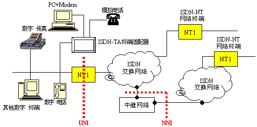 NT1:網(wǎng)絡(luò)終端1,標志本地環(huán)路的物理終結(jié),具有用戶傳輸線終端和用戶網(wǎng)絡(luò)接口(UNI)功能;