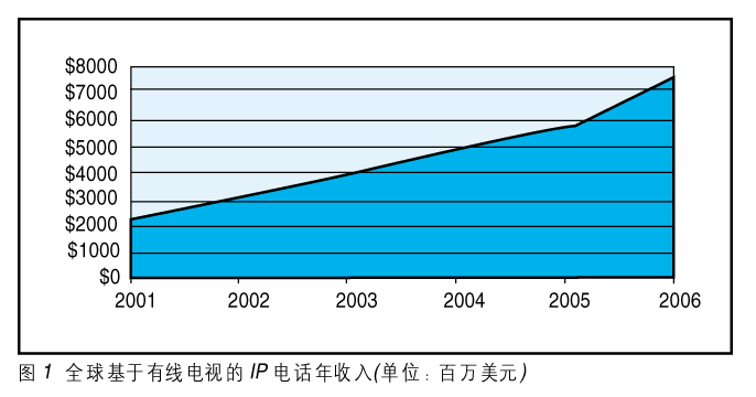 有線電視運營商在尋找使用有線電視基礎網(wǎng)絡HFC的新服務,創(chuàng)造新的經(jīng)濟增長點,提供數(shù)據(jù)、語音、圖像綜合的服務;谟芯電視系統(tǒng)的IP電話將是第一個最有可能推出的新服務。2002年InStat/MDR的分析報告說2006年基于有線電視的IP電話網(wǎng)將達到US$75億的年收入,如圖1所示。