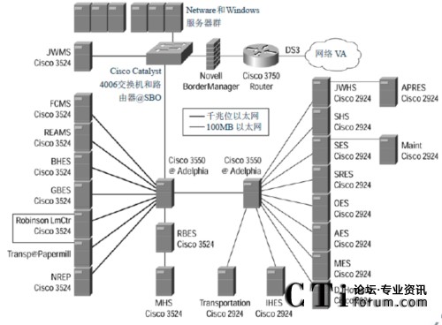 WAN。每所學(xué)校都在布線室中安 裝了一臺自己的 Cisco Catalyst 3524 或者 2924 交換機,并為每個桌面提供了 10Mbps