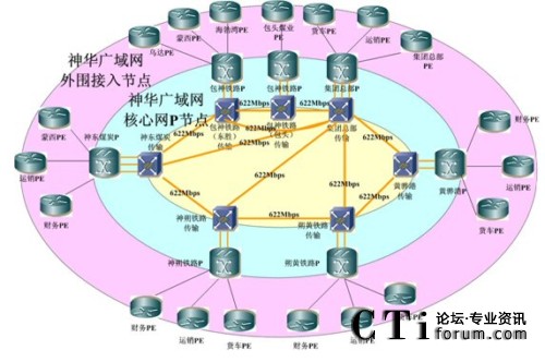 據(jù)神華集團信息管理部廣域網(wǎng)項目負責人說:“該項目建成后將是一個建設在高速傳輸網(wǎng)平臺之上,并利用其提供的線路構成廣域網(wǎng)核心節(jié)點之間的互聯(lián)線路,網(wǎng)絡拓撲在7個核心節(jié)點和以北京節(jié)點為中心直連7個核心節(jié)點的放射型622M環(huán)形+放射混合性企業(yè)頂級骨干廣域數(shù)據(jù)網(wǎng)絡結構。該網(wǎng)絡結構可避免任一段光纜中斷造成某節(jié)點直連線路和環(huán)線同時中斷的可能性,即對網(wǎng)絡單點故障實現(xiàn)環(huán)路保護。同時,網(wǎng)絡中斷到恢復的周期大大縮短:傳輸系統(tǒng)中SDH的環(huán)路自愈從中斷到恢復周期為50ms,網(wǎng)絡節(jié)點之間通過IGP的路由收斂,從中斷到恢復的周期約為200ms!