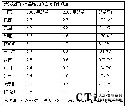 垃圾郵件:社交網(wǎng)站可能是網(wǎng)絡(luò)犯罪尋找新的受害者的地方。然而,垃圾郵件仍然是誘騙人們下載惡意軟件和慫恿他們購(gòu)買諸如假藥等商品的可靠手段。《年度安全報(bào)告》估計(jì),2010年全球范圍的垃圾郵件量與2009年的水平相比,可能會(huì)增加30-40%。然而,思科自己的SensorBase數(shù)據(jù)顯示,美國(guó)和其他經(jīng)濟(jì)發(fā)達(dá)國(guó)家(例如歐盟內(nèi)部的國(guó)家)開(kāi)始在他們各自的國(guó)家關(guān)閉垃圾郵件僵尸(spam zombies),而發(fā)展中國(guó)家(包括印度和越南)已經(jīng)成為垃圾郵件日益增長(zhǎng)的源頭。事實(shí)上,美國(guó)不再是第一大垃圾郵件發(fā)送者。2009年巴西躍居第一。