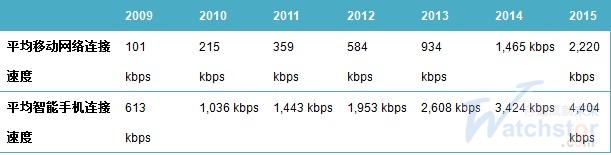 2009年到2010年一年間,平均移動(dòng)網(wǎng)絡(luò)連接速度提升一倍,預(yù)期到2015年將會(huì)增加10倍。移動(dòng)網(wǎng)絡(luò)連接速度是支持移動(dòng)數(shù)據(jù)增長的主要因素。