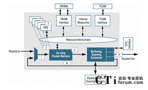 第一代QuantumFlow處理器(QFP)使用90nm工藝, QFP擁有40個定制QFP數(shù)據(jù)包處理引擎(PPE),每個PPE支持4個執(zhí)行線程。利用多達160個并行運行的獨立處理器線程,平均每線程功耗僅0.51W, 遠低于業(yè)界平均水平。同時QFP提供了一個高速的多核互聯(lián)總線,確保每個內(nèi)核都能及時快速的訪問到相關(guān)的資源,并且能夠避免在不夠先進的硬件架構(gòu)中常見的CPU過度使用和超長延遲問題,而傳統(tǒng)的網(wǎng)絡(luò)處理器架構(gòu)僅有少量的內(nèi)核,因此需要使用交換矩陣或總線將多塊網(wǎng)絡(luò)處理器互聯(lián)才能達到和QFP相同的處理速度,其功耗遠高于QFP系統(tǒng),而多塊網(wǎng)絡(luò)處理器資源互相訪問將會帶來大量的數(shù)據(jù)包延遲。