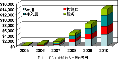 IMS作為一個(gè)通信架構(gòu),開創(chuàng)了全新的電信商業(yè)模式,拓展了整個(gè)信息產(chǎn)業(yè)的市場(chǎng)空間。IMS正在成為新一輪的投資熱點(diǎn)。IDC認(rèn)為,IMS市場(chǎng)將從目前的數(shù)百萬(wàn)美元迅速增長(zhǎng)到2010年的141億美元(如圖1)。對(duì)于電信行業(yè)來說,IMS的意義甚至超出了3G或4G,它將重新定義未來的通信業(yè)務(wù)。