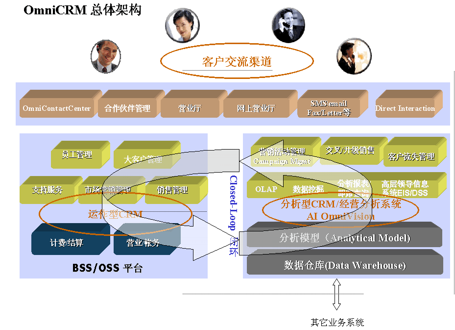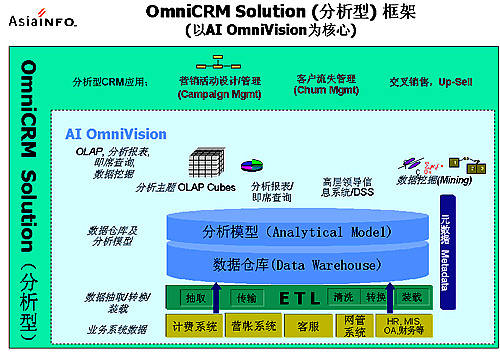 OmniCRM方案是亞信基于多年服務電信市場的豐富的行業(yè)經(jīng)驗,以及對國內(nèi)運營商業(yè)務發(fā)展的深刻認識而推出的,其中,AI OmniVision是OmniCRM方案中經(jīng)營分析型CRM 的核心產(chǎn)品。AI OmniVision不僅符合行業(yè)業(yè)務規(guī)范,而且基于對客戶行為、競爭環(huán)境,商業(yè)獲利率以及其他參數(shù)的透徹分析,能夠使運營商充分了解現(xiàn)有客戶、識別并關注贏利的客戶組、提高服務質量、確保客戶滿意度和忠誠度;同時吸引潛在的客戶;加強提供新服務的投資回報率;提高效率、減小成本,以實現(xiàn)業(yè)務價值的最大化。AI OmniVision采用數(shù)據(jù)倉庫、ETL、OLAP分析、靈活報表展現(xiàn)及數(shù)據(jù)挖掘等技術,包含了用戶分析、業(yè)務分析、收益分析、大客戶分析、營銷分析、競爭分析、服務質量、新業(yè)務分析等眾多功能模塊。