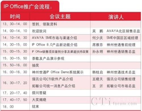 CTI論壇(ctiforum)3月6日消息(記者 潘婷婷): 2011年憑借廣泛的市場宣傳,Avaya IP Office以卓越的產品性能,突出的價格優(yōu)勢得到了廣大代理商的大力支持,取得了優(yōu)異的市場業(yè)績。為了與更多合作伙伴加強交流、密切合作,AVAYA 攜手神州世通,舉辦2012年Avaya IP Office產品渠道推廣大會,屆時將邀請AVAYA領導、產品專家為大家講解 IP Offic 8.0新版本功能、分享經典案例。同時神州世通將推出2012年代理商渠道扶持政策。