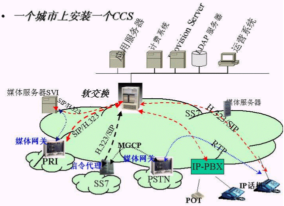為了完整解決城域網(wǎng)上承載話音業(yè)務(wù),實現(xiàn)IP phone 到PSTN、IP phone 到 IP phone、PSTN 到IP phone的呼叫。新太公司的集成方案中包括以下設(shè)備:軟交換核心設(shè)備、媒體網(wǎng)關(guān)、信令網(wǎng)關(guān)、IP PBX、IP 話機、PC IP Softphone、媒體服務(wù)器。