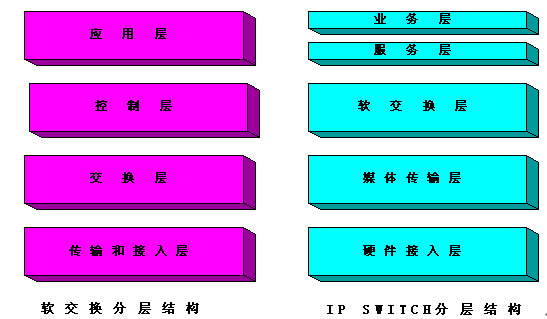 。。SUNTEK IP SWITCH的設(shè)計概念參考業(yè)界前瞻性的NGN體系,其體系結(jié)構(gòu)與軟交換的分層結(jié)構(gòu)的對應(yīng)關(guān)系如下: