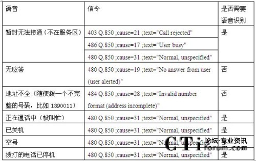 從歸納的情況看,只有無應(yīng)答和地址不全兩種情況是可靠信令分析來識別的,其他的5種情況都無法通過信令檢測識別。特別是暫時無法接通的語言提示,播放完提示音有3種不同的信令,應(yīng)該是屬于不同的情況,但是放了相同的語音。因此造成號碼識別錯誤的現(xiàn)象。