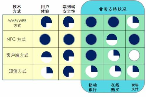移動(dòng)支付(Mobile payment)包括遠(yuǎn)距離方式和近距離方式。遠(yuǎn)距離移動(dòng)支付的主要技術(shù)實(shí)現(xiàn)方式有SMS、WAP、客戶(hù)端(手機(jī)軟件)和USSD;近距離移動(dòng)支付的主要技術(shù)實(shí)現(xiàn)方式有紅外和NFC。各種移動(dòng)支付業(yè)務(wù)技術(shù)實(shí)現(xiàn)方式優(yōu)劣勢(shì)比較詳見(jiàn)圖表1。
