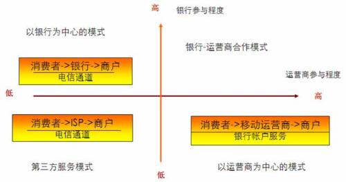 從產(chǎn)業(yè)鏈環(huán)節(jié)上看,移動(dòng)支付的主要參與者主要包括:消費(fèi)者、平臺(tái)提供商、銀行、運(yùn)營(yíng)商和商戶(hù)。其中,銀行和運(yùn)營(yíng)商在其中具有較高的談判能力。因此,可以按照這兩者在產(chǎn)業(yè)鏈中的參與程度,劃分移動(dòng)支付的商業(yè)模式。總的來(lái)說(shuō),銀行機(jī)構(gòu)管理著廣大用戶(hù)的資金帳戶(hù),擁有完善的支付體系,在支付領(lǐng)域具有天然的用戶(hù)信任。運(yùn)營(yíng)商則擁有完備的網(wǎng)絡(luò)設(shè)施和先進(jìn)的IT系統(tǒng),通過(guò)定制終端,運(yùn)營(yíng)商可以將各種先進(jìn)的移動(dòng)應(yīng)用提供給用戶(hù),使用戶(hù)獲得良好的移動(dòng)化生活體驗(yàn)。因此,運(yùn)營(yíng)商在這方面具有較好的用戶(hù)資源和營(yíng)銷(xiāo)渠道。