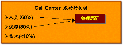 企業(yè)必須牢記在心,成功運(yùn)營呼叫中心的三要素 人員、流程和技術(shù),三項(xiàng)缺一不可,而更重要的是如何適當(dāng)?shù)卣线@三項(xiàng)要素。鑒于以往經(jīng)驗(yàn),呼叫中心的成功與否,人的因素占60%,流程因素占30%,而技術(shù)因素只占10%。這并不表示可以忽視技術(shù)的重要性,技術(shù)一樣很重要。如果沒有當(dāng)今日新月異的科技,企業(yè)便無法實(shí)現(xiàn)呼叫中心的運(yùn)營;而成功地實(shí)現(xiàn)呼叫中心有效的管理與運(yùn)營,關(guān)鍵在于管理能力,也就是對人員及流程的把握。
