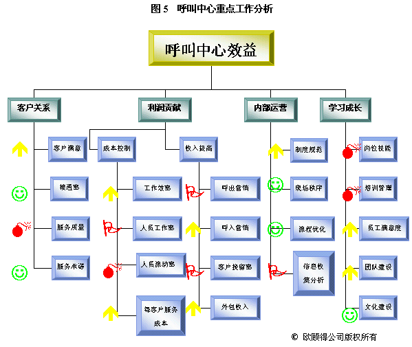 根據(jù)年度重點(diǎn)工作及目標(biāo),我們就可以設(shè)計(jì)關(guān)鍵措施來(lái)使其實(shí)現(xiàn)。通常一項(xiàng)關(guān)鍵措施可以有助于幾個(gè)目標(biāo)的達(dá)成。如建立培訓(xùn)體系,可以使得在崗培訓(xùn)、上崗培訓(xùn)、多技能訓(xùn)練以及崗位技能達(dá)標(biāo)率有所提升,而體現(xiàn)在業(yè)務(wù)上的效果則是服務(wù)質(zhì)量的提升、呼出營(yíng)銷收入增加和客戶挽留率提高。