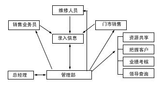 根據英普的業(yè)務管理模式,公司將門市銷售、維修部、大客戶部的業(yè)務管理工作,交由管理部全部管理和協(xié)調,這三個部門將各自與客戶接待、交往過程、工作計劃全部明細記錄,交由管理部確認,管理部在保證必要保密的情況下,進行工作再分配,同時加強業(yè)務考核和其他管理職能工作。其業(yè)務流程如圖1。