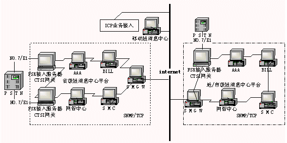 用戶(hù)電話(huà)終端撥入PSTN網(wǎng),經(jīng)FSK接入服務(wù)器接入平臺(tái),經(jīng)過(guò)CTSI網(wǎng)關(guān)進(jìn)行CTSI協(xié)議的轉(zhuǎn)換,AAA服務(wù)器進(jìn)行認(rèn)證和計(jì)帳,BIL計(jì)費(fèi)出帳服務(wù)器進(jìn)行批價(jià)和出帳,短消息中心SMC收發(fā)短消息,利用短消息網(wǎng)關(guān)接收訂閱、點(diǎn)播的信息,并經(jīng)短消息網(wǎng)關(guān)與移動(dòng)GSM網(wǎng)、Internet網(wǎng)互通短消息。