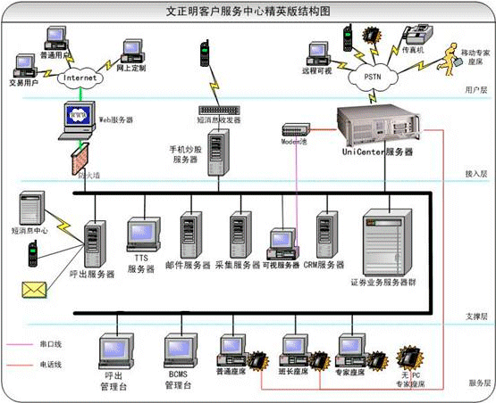 泰陽證券有客戶2萬多,相當(dāng)一部分要通過電話委托程序作交易。原有電話委托系統(tǒng)是模擬線。交易忙時(shí),很多股民打不進(jìn)去。以前的業(yè)務(wù)相對(duì)也比較簡(jiǎn)單。文正明公司在了解了泰陽方面的業(yè)務(wù)需要后,用公司的UniCenter系統(tǒng)和深圳東進(jìn)公司的ISDN數(shù)字卡、傳真卡和座席卡,為泰陽搭建了一個(gè)新的語音應(yīng)用平臺(tái)。