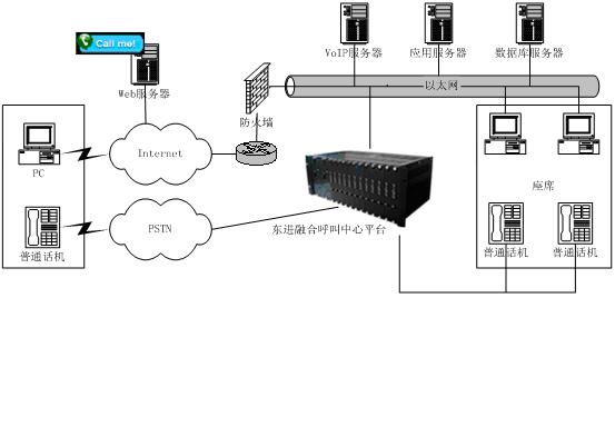 to Talk)”發(fā)展到“點(diǎn)擊到交談(Click to Talk)”,通過Internet可以提供IP電話語音呼叫、Call Back、IP傳真、IM、E-mail等功能,擴(kuò)展了通信渠道,一方面用戶可以實(shí)現(xiàn)免費(fèi)接入到呼叫中心,另一方面企業(yè)能夠向更多的客戶提供優(yōu)質(zhì)、方便的服務(wù)資源,而且由于這些資源的價(jià)格相對傳統(tǒng)通信便宜,使企業(yè)為客戶提供全國、乃至于全球服務(wù)成為可能,提高了企業(yè)客戶服務(wù)水平,增強(qiáng)了企業(yè)競爭力。東進(jìn)互聯(lián)網(wǎng)呼叫中心系統(tǒng)結(jié)構(gòu)如圖所示: