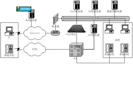 相對于傳統(tǒng)以PSTN網(wǎng)接入的呼叫中心,東進(jìn)互聯(lián)網(wǎng)呼叫中心增加了系統(tǒng)與Internet的接入,將原來由IVR完成的操作通過Web頁面上的流程實(shí)現(xiàn),這樣用戶通過下拉菜單、簡單填寫、點(diǎn)擊按鈕等操作完成客戶識別、業(yè)務(wù)識別等操作,這些流程完成后,通過VoIP對呼叫中心呼入,由呼叫中心對呼入進(jìn)行受理,再按照相應(yīng)的原則分配到座席,座席再作相應(yīng)的應(yīng)答和處理,從而為客戶提供了一個(gè)通過Web站點(diǎn)直接進(jìn)入呼叫中心的途徑,把Internet所具有的豐富信息資源和強(qiáng)大的功能賦予呼叫中心,它向客戶提供一個(gè)可訪問的Web站點(diǎn),使得呼叫中心從“撥叫到交談(Dial