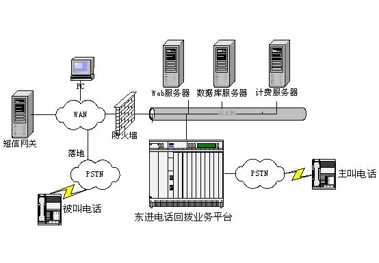 東進(jìn)電話回?fù)芟到y(tǒng)由東進(jìn)電話回?fù)芷脚_、數(shù)據(jù)庫服務(wù)器、Web服務(wù)器和計(jì)費(fèi)服務(wù)器組成。虛擬運(yùn)營商在基礎(chǔ)運(yùn)營商那租用模擬或數(shù)字中繼電話線路連接到東進(jìn)電話回?fù)芷脚_,回?fù)苤鹘杏脩羰褂肞STN線路,撥被叫用戶使用寬帶IP寬帶網(wǎng)絡(luò),虛擬運(yùn)營商需要尋找落地資源,通過互聯(lián)網(wǎng)可以很容易得到。