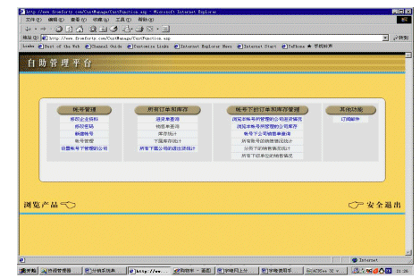 ebanswers分銷(xiāo)系統(tǒng)的一個(gè)重要特色就是自助管理平臺(tái),用戶可以在這個(gè)平臺(tái)中完成絕大部分管理、查詢和統(tǒng)計(jì)的工作。自助管理平臺(tái)主要有四大部分組成:帳號(hào)管理、公司下訂單和庫(kù)存管理、帳號(hào)下訂單和庫(kù)存管理、其他功能。其中帳號(hào)管理主要是管理與公司和帳號(hào)有關(guān)的各類(lèi)信息,公司下訂單和庫(kù)存管理、帳號(hào)下訂單和庫(kù)存管理這兩個(gè)部分主要是用來(lái)查詢和統(tǒng)計(jì)各項(xiàng)信息的。