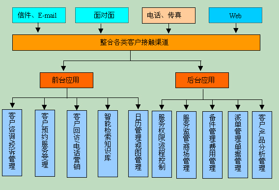 后臺(tái)客服應(yīng)用子系統(tǒng)能夠很方便地與前臺(tái)呼叫中心整合,以更全面的功能,提供一流的客戶服務(wù)。整個(gè)后臺(tái)系統(tǒng)包括一系列完善的功能:客戶咨詢/投訴管理、客戶預(yù)約服務(wù)受理、客戶回訪/電話營(yíng)銷(xiāo)、智能檢索知識(shí)庫(kù)、日歷管理/視圖管理、服務(wù)權(quán)限/流程控制、服務(wù)監(jiān)管/商場(chǎng)管理、備件管理/費(fèi)用管理、派單管理/單據(jù)管理、客戶/產(chǎn)品分析管理。