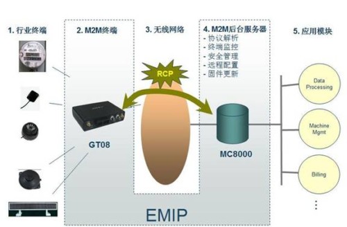 所有的M2M方案都具有的五要素是行業(yè)終端、M2M終端、無線傳輸網(wǎng)絡、M2M后臺服務器以及應用模塊。為了能快速有效及低成本地適應M2M市場上各種各樣的行業(yè)應用,愛立信提出智能平臺EMIP的概念(如圖所示)。該智能平臺由GT08系列終端和MC8000管理服務器組成。