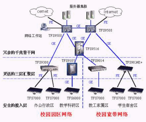 針對(duì)校園網(wǎng)的業(yè)務(wù)需求和建網(wǎng)中所面臨的問(wèn)題,同方網(wǎng)絡(luò)公司提出了自己有特色的解決方案。