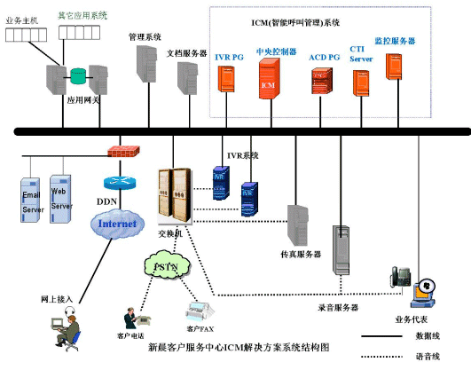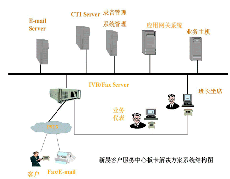 新晨客戶服務(wù)中心普及型解決方案是在以專用交換機或PC服務(wù)器加語音卡作為電話接入設(shè)備,如果用PC服務(wù)器加語音卡作為電話接入設(shè)備,將電話中繼線直接接到IVR上。此方案中的CTI系統(tǒng)能夠適用于流行的語音板卡和多種電話交換機的不同環(huán)境,這種解決方案主要針對小型的客戶服務(wù)中心推出。