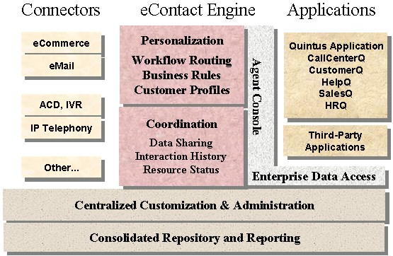 Quintus最新推出的Quintus eContact Suit 5.6是一套完整全面的CRM解決方案,包括交互層次的CRM——客戶接觸中心,運(yùn)營(yíng)層次的CRM——Quintus CRM應(yīng)用(如CallCenterQ、SalesQ等)和分析層次的CRM——Quintus報(bào)表分析系統(tǒng)