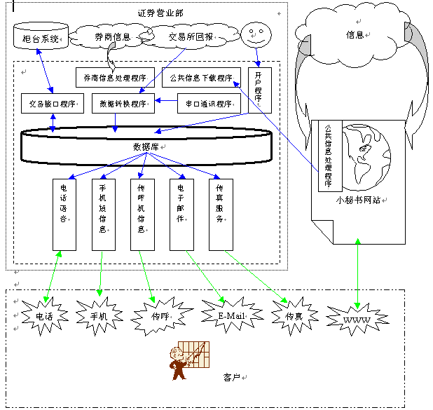面對(duì)越來越激烈的競(jìng)爭(zhēng),各個(gè)券商使出渾身解數(shù),推出如透支、手續(xù)費(fèi)返還等各種吸引客戶的手段;運(yùn)用各種各樣的的交易方式如:營業(yè)部大戶室、家庭遠(yuǎn)程大戶室、網(wǎng)上交易、電話委托以及手機(jī)炒股、股易通、WAP網(wǎng)上交易等等。然而,這些都屬于被動(dòng)的服務(wù)方式,對(duì)于業(yè)余炒股的大多數(shù)中小戶、散戶來說,不可能每天花數(shù)小時(shí)瀏覽股市的各種信息。因此,不知道配股繳款、錯(cuò)過配售新股等情況時(shí)有發(fā)生,給客戶造成較大的經(jīng)濟(jì)損失;一些重大消息、重大新聞不能及時(shí)獲知,延誤了投資的有利時(shí)機(jī)。據(jù)調(diào)查,目前參加二級(jí)市場(chǎng)配售的投資者比例不足20%。