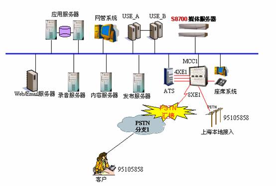 1、采用AVAYA的S8700作為排隊系統(tǒng),MCC1作為媒體網(wǎng)關,全國280多個城市的客戶撥打本地電話通過電信網(wǎng)絡匯接到上海中心;