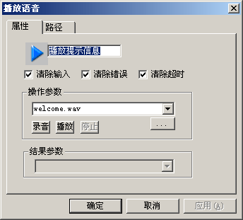 并不是所有的模塊都有操作參數(shù)和結果參數(shù),有些模塊可能只有其中的一個,有些模塊兩個參數(shù)都沒有。例如:播放語音模塊必需有操作參數(shù)--要播放的語音文件的文件名,但它沒有結果參數(shù);存儲變量模塊必需有結果參數(shù)--變量名,但它沒有操作參數(shù);運算模塊既有操作參數(shù),也有結果參數(shù);取消轉隊列模塊和退出模塊則沒有參數(shù)。