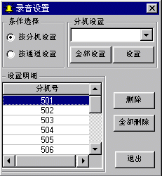 錄音設(shè)置有兩種(見下圖):一種是按分機(jī)設(shè)置,即不管分機(jī)在哪個內(nèi)線通道,只要通話(包括會議)就錄音;另一種是把外線通道設(shè)置成錄音通道,并且能自動對IVR過程進(jìn)行單獨(dú)錄音。