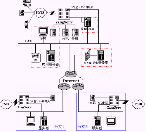 目前清華誠志數(shù)碼公司分支機(jī)構(gòu)有5個,可以通過ZingServ交換機(jī)的內(nèi)置VoIP功能在5個分支機(jī)構(gòu)實(shí)現(xiàn)組網(wǎng),從而大大節(jié)省長話費(fèi)用,并實(shí)現(xiàn)內(nèi)部分機(jī)號統(tǒng)一編碼: