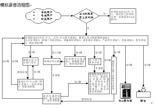- 本系統(tǒng)的服務(wù)內(nèi)容包括:企業(yè)與政府部門(mén)簡(jiǎn)介,產(chǎn)品與服務(wù)簡(jiǎn)介,人工服務(wù),轉(zhuǎn)部門(mén)分機(jī),呼叫轉(zhuǎn)移,部門(mén)直線電話號(hào)碼查詢,質(zhì)量與服務(wù)投訴,錄音留言等。