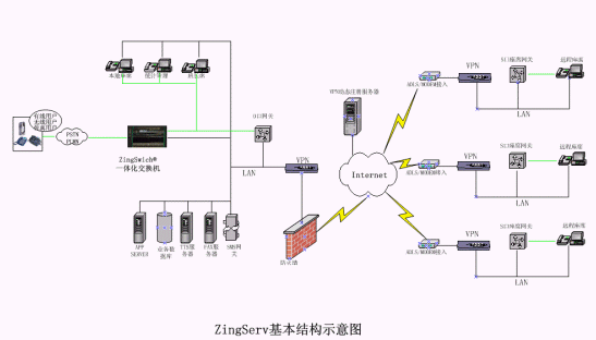 硬件:中心點(diǎn)有ZingSwitch®,O口網(wǎng)關(guān)和內(nèi)線卡,VPN動(dòng)態(tài)注冊(cè)服務(wù)器和VPN設(shè)備,或GK服務(wù)器。座席端配置S口網(wǎng)關(guān),根據(jù)需求配置相應(yīng)的VPN設(shè)備。