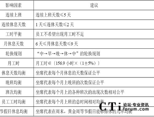要滿足每半小時(shí)實(shí)際安排的座席數(shù)量不少于需要的座席數(shù)量的要求,首先就需要進(jìn)行班次的設(shè)計(jì),這是為第五環(huán)節(jié)資源規(guī)劃而準(zhǔn)備的!鞍啻卧O(shè)計(jì)”是指設(shè)計(jì)出一系列的班次,比如早班,中班,晚班,等等。而將來(lái)只要告訴員工,你下個(gè)月每天各上什么樣的班次即可。在班次設(shè)計(jì)時(shí),需要充分考慮前面提到的一些影響因素:如下所示。