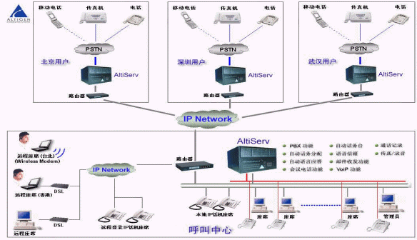 AltiCenter 將奧迪堅(jiān)所倡導(dǎo)的基于IP分布式呼叫中心技術(shù)完美轉(zhuǎn)化為產(chǎn)品,為用戶輕松構(gòu)建基于IP的分布式呼叫中心系統(tǒng)。該呼叫中心不僅提供語音電話,還能提供包括音頻視頻在內(nèi)的多媒體通信;不僅能支持傳統(tǒng)的電話終端,還能支持來自Internet的語音、數(shù)據(jù)信息等多種交互方式;不僅提供了完整的本地座席功能,還提供遠(yuǎn)程IP座席,遠(yuǎn)程IP專家座席,并提供高度統(tǒng)一實(shí)用的呼叫中心管理體系。AltiCenter在設(shè)計(jì)之初就采用IP內(nèi)核的一體化設(shè)計(jì),不需要任何語音網(wǎng)關(guān)設(shè)備,就可以在網(wǎng)絡(luò)上構(gòu)建一個(gè)語音和數(shù)據(jù)的統(tǒng)一平臺(tái),無論在世界的哪個(gè)角落,遠(yuǎn)程IP座席和分布的異地機(jī)構(gòu)都可以共享客戶的所有資源(語音、數(shù)據(jù)、座席),由于采用了先進(jìn)的VoIP技術(shù),可以為各地的電話和Internet的客戶提供統(tǒng)一的客戶號(hào)碼和統(tǒng)一的客戶服務(wù),并極大地降低呼叫中心的運(yùn)營成本,真正幫助用戶建立一個(gè)高效的、信息共享的分布式呼叫中心系統(tǒng)。