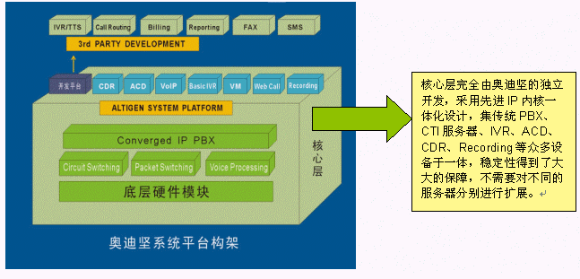 交換功能作為整個系統(tǒng)的核心功能,是系統(tǒng)一切功能的基礎。奧迪堅高度一體化通訊服務器AltiServ,采用先進的DSP等技術,將傳統(tǒng)的語音交換和IP包交換在系統(tǒng)底層實現(xiàn),使系統(tǒng)的技術水平、功能及穩(wěn)定性達到了一個新的高度,可以實現(xiàn)大容量電話的呼入/呼出處理、電話轉接、支持PRI、E1、中國一號信令、七號信令、模擬線路等多種接入方式,同時還具備傳統(tǒng)PBX所不具備的強大的語音信箱、電話會議功能、VoIP、界面友好的系統(tǒng)管理功能等。由于在底層對VoIP支持,所以既可以使用普通電話機,也可以使用IP話機或者軟電話登陸到系統(tǒng),豐富了用戶的選擇的范圍,方便了用戶使用并節(jié)省投資,并且VoIP技術擴展了增值空間,可以用IP座席輕松構建遠程專家座席,更加適合互聯(lián)網時代的應用。