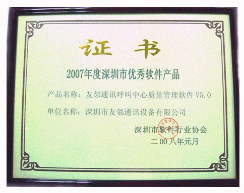 2008年3月14日,深圳市友鄰?fù)ㄓ嵲O(shè)備有限公司(以下簡(jiǎn)稱“友鄰?fù)ㄓ崱保┬,公司主打軟件產(chǎn)品“友鄰?fù)ㄓ嵑艚兄行馁|(zhì)量管理軟件V5.0”(即 AP Suite 呼叫中心質(zhì)量管理系統(tǒng)V5.0)榮獲深圳市軟件行業(yè)協(xié)會(huì)“2007年度深圳市優(yōu)秀軟件產(chǎn)品”榮譽(yù)稱號(hào)。