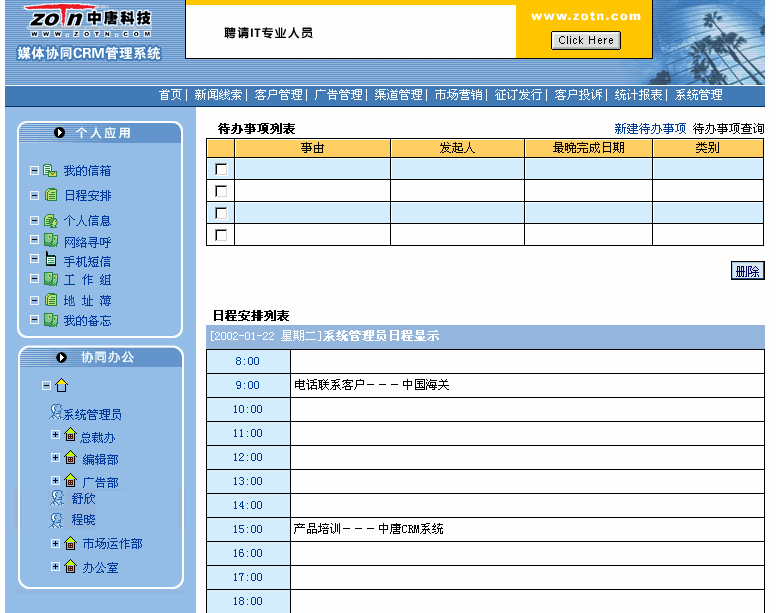協(xié)同CRM實現(xiàn)單位內(nèi)部各個部門、各地分支機構(gòu)、代理商以客戶為中心協(xié)同工作,具體功能包括對新聞線索的管理,對廣告的管理,對征訂發(fā)行的管理,客戶反饋的管理,客戶信息分析決策,競爭對手管理、檢索統(tǒng)計輸出、系統(tǒng)維護(hù)等模塊。