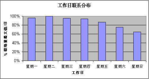 在規(guī)劃客戶服務中心規(guī)模時,最困難的問題之一是:通過時間估計呼叫分配。通過一個 24 x 7 的工作安排,移動電信公司必須按天估計他們將要處理的聯系量。下圖顯示一個移動電信公司工作日典型的聯系分布: