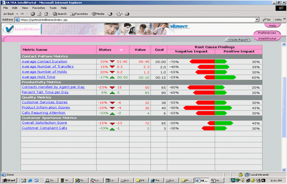 IntelliMiner使用專利的數(shù)據(jù)挖掘技術(shù),自動(dòng)分析導(dǎo)致呼叫中心關(guān)鍵行為指標(biāo)(KPI)和呼叫中心設(shè)定目標(biāo)的因素及其關(guān)系和影響。所分析的數(shù)據(jù)揭示了導(dǎo)致呼叫中心KPI表現(xiàn)的潛在原因,例如過(guò)長(zhǎng)的通話時(shí)間,過(guò)多的轉(zhuǎn)接次數(shù),過(guò)長(zhǎng)的保持時(shí)間,降低生產(chǎn)力和降低客戶滿意度。針對(duì)分析的結(jié)果,用戶可以去回放相關(guān)的呼叫,找到導(dǎo)致這些因素的原因所在。