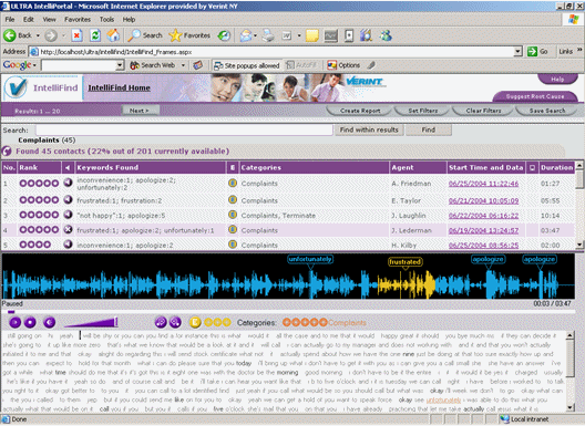 IntelliFind將客戶呼叫轉(zhuǎn)換成可搜索的數(shù)據(jù)庫(kù)形式,根據(jù)業(yè)務(wù)分類、短語(yǔ)和關(guān)鍵字鑒別呼叫。IntelliFind使用語(yǔ)音文本轉(zhuǎn)換技術(shù)轉(zhuǎn)換客戶呼叫錄音,幫助用戶理解客戶交互的情況。