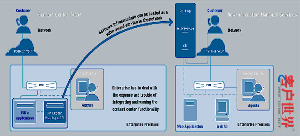 以國外的托管服務(wù)若建立在800號于C4/C5局用交換機上,許多用戶可以不用建制本地的排隊機就可以實現(xiàn)托管服務(wù)。目前國內(nèi)的運營商若要直接在C4/C5局用交換機因為沒有C4/C5的CTI服務(wù)器可以連接,所以有其困難的地方,只能采用800號智能網(wǎng)新增業(yè)務(wù)與本地企業(yè)排隊機連網(wǎng)的方式來完成。但國內(nèi)運營商未來都會朝向NGN,采用軟交換的方向來看,企業(yè)可能再也不用采購本地排隊機,對于呼叫中心托管的業(yè)務(wù)是一個很好的方向。