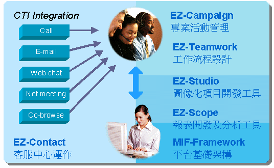 EZactor客服中心CRM平臺系統(tǒng),以MIF-Framework模塊為平臺基礎架構(gòu),在該強大之穩(wěn)定架構(gòu)上以EZ-Contact模塊作為客服中心運作核心,另外延伸有EZ-Campaign、EZ-Teamwork、EZ-Scope、EZ-Studio等模塊,分別提供營銷活動管理、工作流程設計、數(shù)據(jù)統(tǒng)計與分析、項目開發(fā)工具等功能,全面滿足客服中心運行之需要。