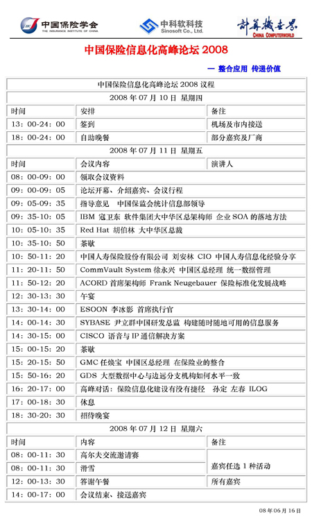 7月10日至12日, 中國(guó)保險(xiǎn)信息化高峰論壇2008將于北京順義區(qū)喬波國(guó)際會(huì)議中心盛大舉行, 此次大會(huì)的邀請(qǐng)來(lái)賓有包括中國(guó)人保,太平保險(xiǎn),中國(guó)人壽,中國(guó)太平洋保險(xiǎn),華泰保險(xiǎn),陽(yáng)光財(cái)險(xiǎn)等保險(xiǎn)業(yè)的最優(yōu)秀的企業(yè)。億迅作為最佳廠商之一,也得到該會(huì)主辦方的盛情邀請(qǐng),屆時(shí)將與各大保險(xiǎn)企業(yè)技術(shù)主管,保險(xiǎn)公司副總經(jīng)理,保監(jiān)會(huì)相關(guān)領(lǐng)導(dǎo)以及資深保險(xiǎn)行業(yè)信息化建設(shè)專家共同聆聽來(lái)自保監(jiān)會(huì)領(lǐng)導(dǎo)的指導(dǎo)性意見(jiàn),交流重要企業(yè)的優(yōu)秀解決方案,分享系統(tǒng)集成商的最直接方案對(duì)比。會(huì)議期間,億迅公司大中華區(qū)執(zhí)行副總張佑佶先生將有一個(gè)演講時(shí)段,與保險(xiǎn)業(yè)的新老朋友共同研討“呼叫中心信息化在兩岸三地的魅力趨勢(shì)”,全情期待中……