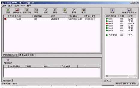 3) 分機(jī)用戶軟件:安裝在客戶的計(jì)算機(jī)中,是可以在屏幕上進(jìn)行多種語音、數(shù)據(jù)處理的綜合信息中心,它將語音郵件和普通電子郵件完美結(jié)合;其界面操作功能親近直觀。