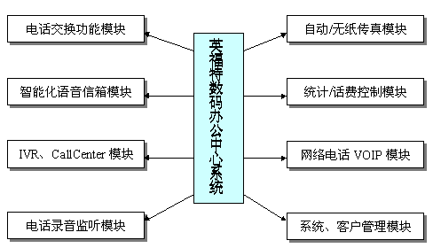 模塊包括:一號(hào)通功能、語音留言、留言通知功能、客戶通過密碼遠(yuǎn)程登錄控制功能、與電子郵件集成的語音郵件(Voice Mail)系統(tǒng)、群組廣播功能等功能。